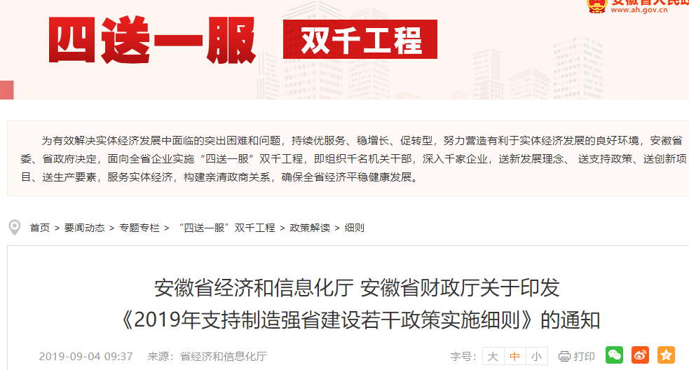 安徽省印發(fā)《關(guān)于印發(fā)支持制造強(qiáng)省建設(shè)若干政策的通知》,對(duì)獲得國家智能制造試點(diǎn)示范項(xiàng)目的企業(yè)給予一次性獎(jiǎng)補(bǔ)200萬元。 此外,經(jīng)省認(rèn)定的智能工廠、數(shù)字化車間,分別給予企業(yè)一次性獎(jiǎng)補(bǔ)100萬元、50萬元;對(duì)通過國家信息化和工業(yè)化融合管理體系標(biāo)準(zhǔn)評(píng)定的企業(yè)給予一次性獎(jiǎng)補(bǔ)50萬元;對(duì)年度購置10臺(tái)及以上工業(yè)機(jī)器人(自由度≥4)的企業(yè),按購置金額的20%給予一次性獎(jiǎng)補(bǔ)。